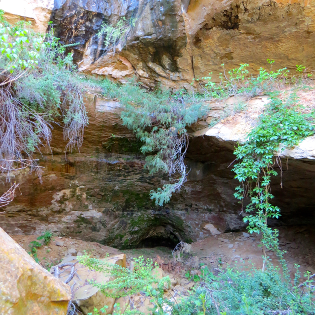 Green area in back of Long House where water is seeping in.